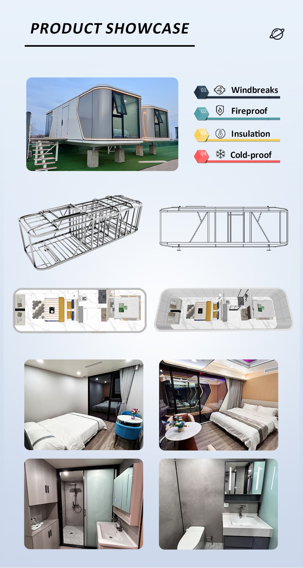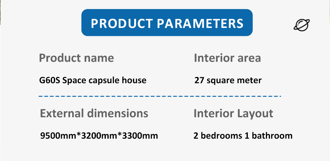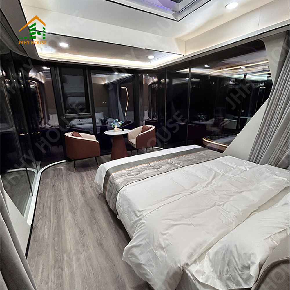 | نظام الديكور الداخلي | سقف معلق (لوح OSB + لوح ألياف الكربون) سطح الجدار الداخلي (لوح OSB + لوح ألياف الكربون) الأرضيات الداخلية (اللوح + لوح ألياف الكربون) (أرضيات قفل SPc) أنظمة التدفئة تحت الأرضية باب الحمام (باب زجاجي منزلق للخصوصية) حوض غسيل (رخام حسب الطلب) جدران الحمام (لوحة قفل SPC) أرضية الحمام (البلاط) الأثاث مثل الأسرة، وطاولات السرير، والأرائك، وما إلى ذلك (يمكن تخصيصها) |